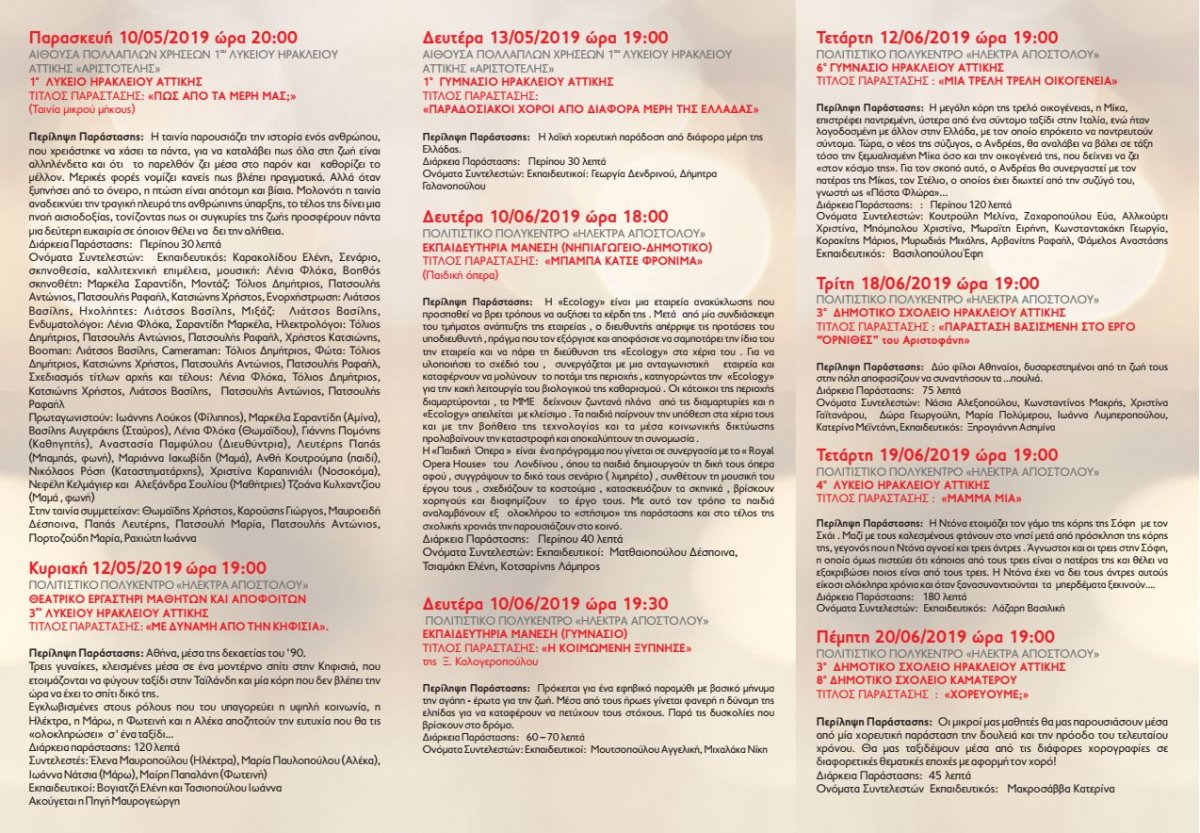 Βήμα στην καλλιτεχνική δημιουργία και έκφραση των παιδιών δίνει και φέτος το Φεστιβάλ Ηρακλείου Σχολικά Δρώμενα που διοργανώνει για 5η συνεχή χρονιά ο Δήμος Ηρακλείου Αττικής. Σε επιλεγμένες ημερομηνίες του Μαΐου και του Ιουνίου οι θεατρικές ομάδες των μαθητών από τα σχολεία της πόλης ανεβαίνουν στο σανίδι των θεατρικών σκηνών του Πολιτιστικού Πολύκεντρου και του 1ου Λυκείου για να παρουσιάσουν πρωτότυπες παραγωγές και διασκευασμένα έργα από το ελληνικό και το διεθνές ρεπερτόριο.