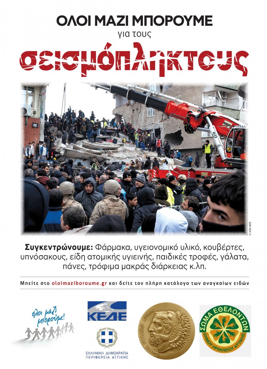 Ο Δήμος συμμετέχει και στη δράση του Όλοι Μαζί Μπορούμε, ενώνοντας τις δυνάμεις του με τους δήμους όλης της χώρας και την Περιφέρεια Αττικής. Έτσι, η δράση συγκέντρωσης ειδών στήριξης για τους σεισμοπαθείς επεκτείνεται ως εξής: