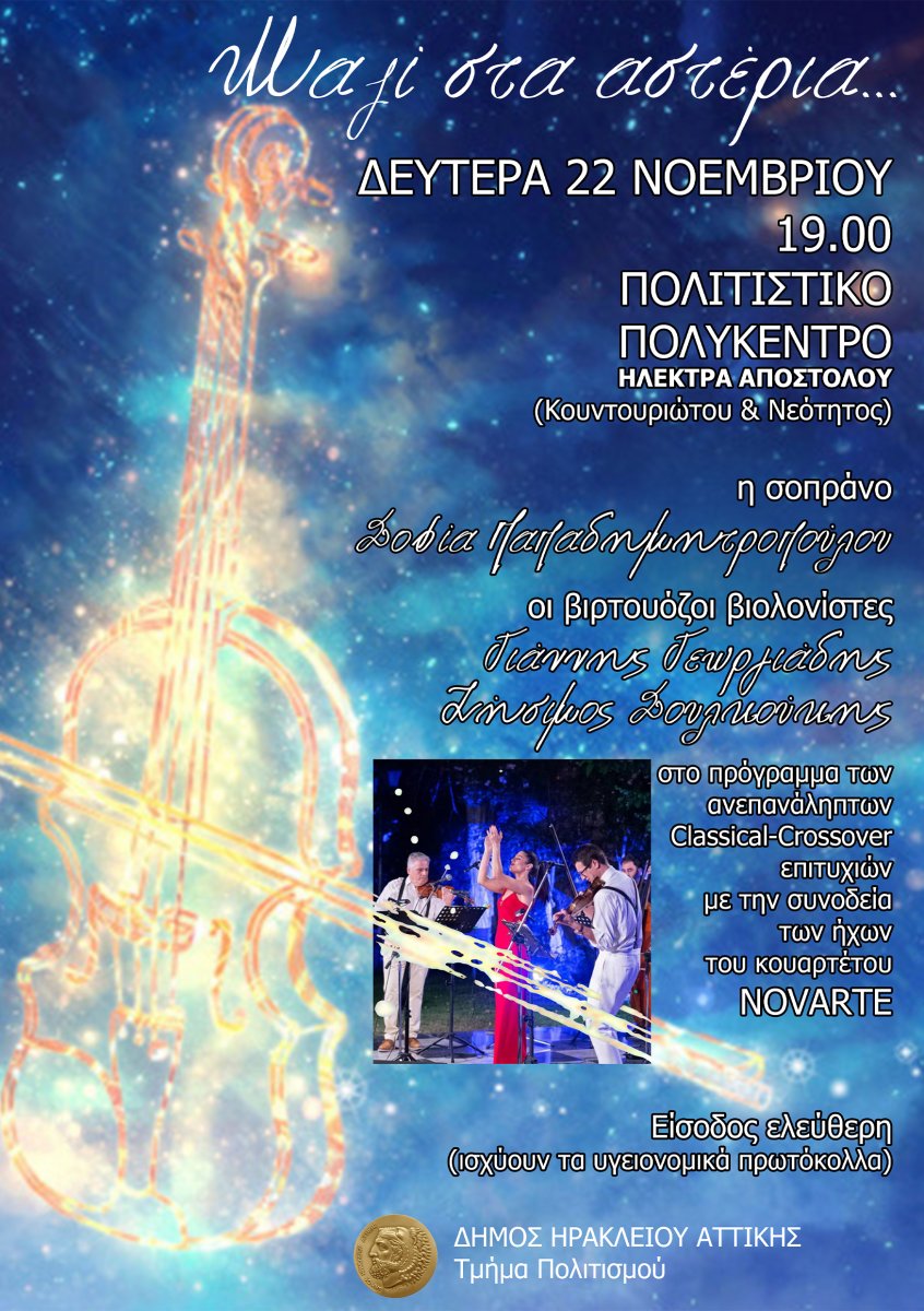 Μια μοναδική συναυλία υπό τους μαγικούς ήχους των βιολιών των βιρτουόζων, Γιάννη Γεωργιάδη, Ζήσιμου Σουλκούκη και την μελωδική φωνή της σοπράνο Σοφίας Παπαδημητροπούλου διοργανώνει ο Δήμος Ηρακλείου Αττικής τη Δευτέρα 22 Νοεμβρίου στις 19.00 το απόγευμα στον χώρο του Πολιτιστικού Πολύκεντρου «Ηλέκτρα Αποστόλου» (Κουντουριώτου και Νεότητος).