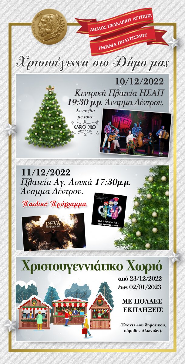 Τα Χριστούγεννα είναι λίγες ημέρες μακριά και ο Δήμος Ηρακλείου Αττικής βάζει τα γιορτινά του για να ανεβάσει τη διάθεση μικρών και μεγάλων. Η πόλη έχει ήδη στολιστεί, έτοιμη για το σύνθημα της… επίσημης έναρξης της εορταστικής περιόδου με τη φωταγώγηση του μεγάλου Χριστουγεννιάτικου δέντρου του Δήμου, στην κεντρική πλατεία το Σάββατο 10 Δεκεμβρίου στις 19.30 παρέα με τους Gadjo Dilo. Το χριστουγεννιάτικο φως πρέπει να φτάσει σε κάθε άκρη της πόλης και έτσι την Κυριακή 11 Δεκεμβρίου στις 17.30 ανάβει ακόμα ένα δέντρο, στην πλατεία του Αγίου Λουκά, αυτή τη φορά με παιδικό πρόγραμμα. Η μεγάλη ατραξιόν όμως των φετινών Χριστουγέννων στο Ηράκλειο είναι το Χριστουγεννιάτικο Χωριό που ο Δήμος στήνει από τις 23 Δεκεμβρίου έως τις 2 Ιανουαρίου στον χώρο απέναντι από το 4ο Δημοτικό της πόλης (πάροδος Αλωνίων) με πολλά παιχνίδια και εκπλήξεις για όλους τους μικρούς Ηρακλειώτες ή όσους θέλουν να νιώσουν και πάλι παιδιά την περίοδο των Χριστουγέννων. Η είσοδος σε όλες τις εκδηλώσεις αλλά και στο Χριστουγεννιάτικο Χωριό είναι δωρεάν για όλους.