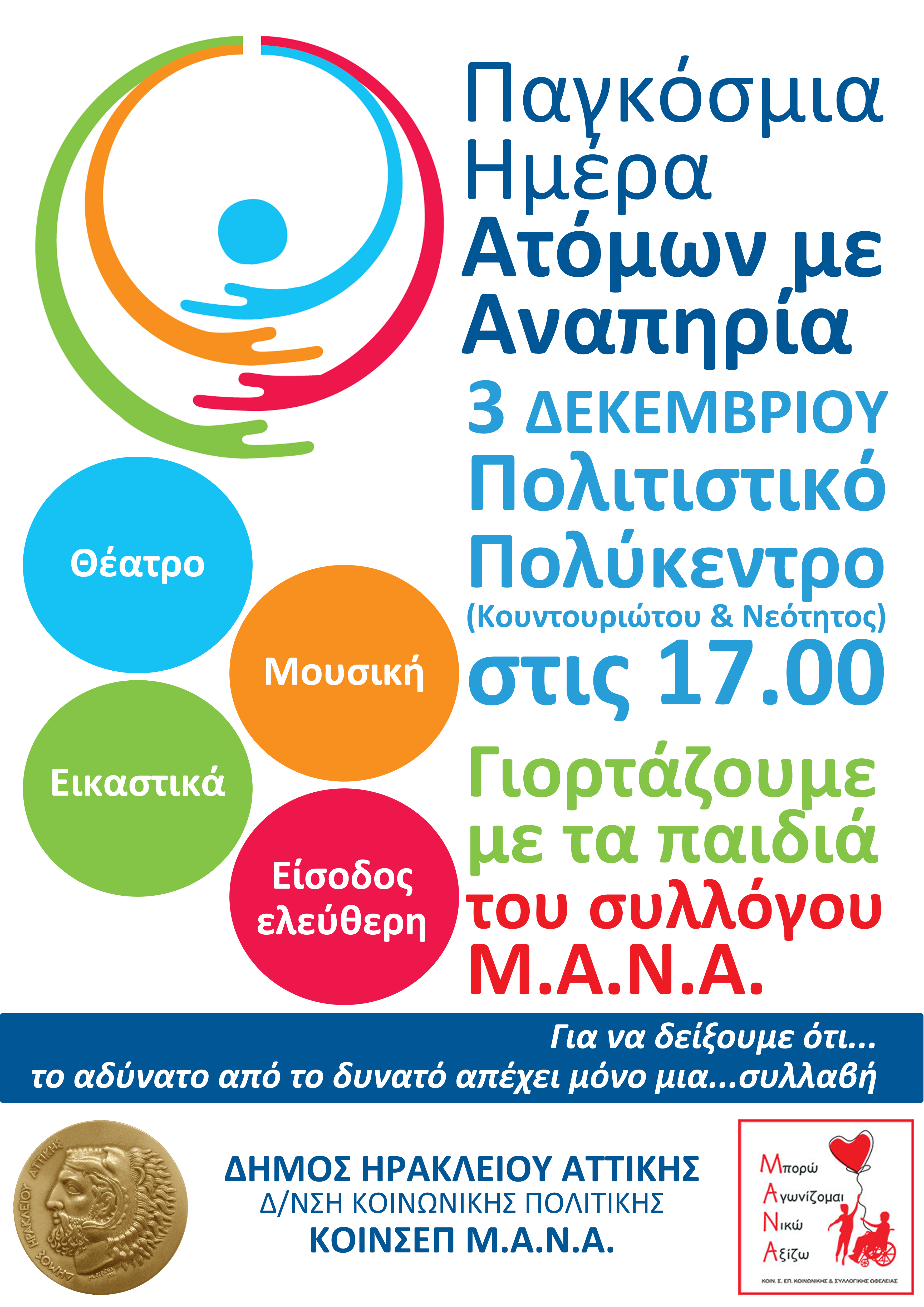 Μια ξεχωριστή εκδήλωση, για ξεχωριστά παιδιά: Ο Δήμος Ηρακλείου Αττικής και ο  τιμά την Παγκόσμια Ημέρα Ατόμων με Αναπηρία και, μαζί με την  Κοιν.Σ.Επ. «Μ.Α.Ν.Α»,  διοργανώνουν ένα ζεστό απόγευμα για τα παιδιά του Συλλόγου, αλλά και όλα τα παιδιά της πόλης, την Τρίτη 3 Δεκεμβρίου στις 17.00 το απόγευμα, στο Πολιτιστικό Πολύκεντρο «Ηλέκτρα Αποστόλου» (Κουντουριώτου & Νεότητος) για να αποδείξουμε ότι «το αδύνατο από το δυνατό απέχει μόνο μία συλλαβή…».
