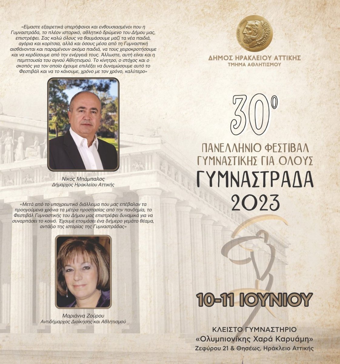 Το Φεστιβάλ Γυμναστικής για όλους, η ιστορική Γυμναστράδα, του Δήμου Ηρακλείου Αττικής επιστρέφει φέτος για την 30η διοργάνωσή της, αυτό το Σαββατοκύριακο 10 και 11 Ιουνίου στο δημοτικό Κλειστό Γυμναστήριο «Ολυμπιονίκης Χαρά Καρυάμη» (Ζεφύρου 21). Και το κάνει δυναμικά, καθώς σε αυτές τις δύο ημέρες, ξεκινώντας από τις 10.00 το πρωί έως το βράδυ, από το ταπί του Κλειστού θα περάσουν πάνω από 2000 αθλητές και αθλήτριες όλων των ηλικιών, εκπροσωπώντας περί τους 45 αθλητικούς συλλόγους και ομάδες σε ένα μοναδικό θέαμα αποτελούμενο από 80 προγράμματα γυμναστικών επιδείξεων που έχει οργανώσει το Τμήμα Αθλητισμού του Δήμου.
