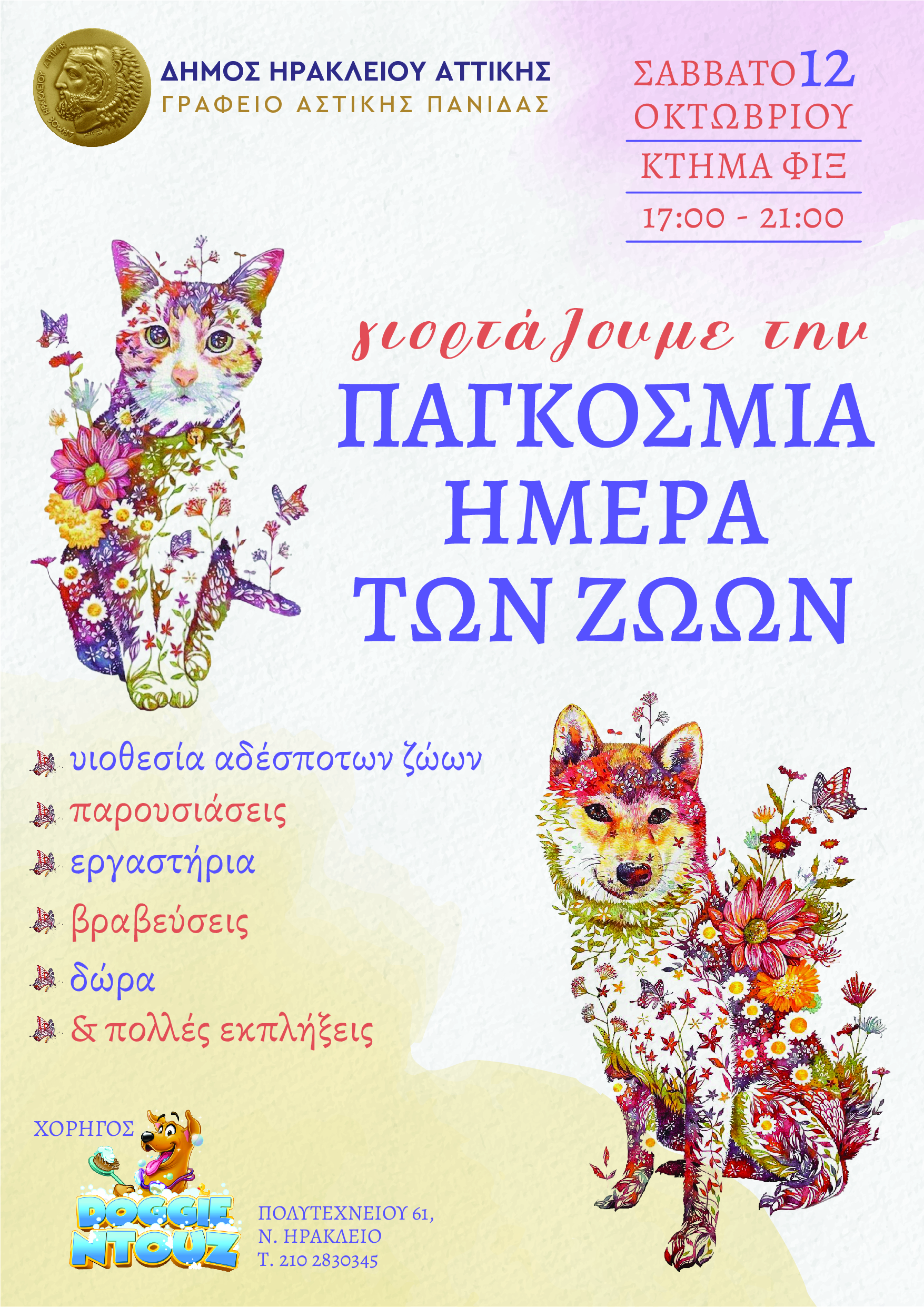 Ο Δήμος Ηρακλείου Αττικής γιορτάζει την Παγκόσμια Ημέρα των Ζώων και καλεί μικρούς και μεγάλους φιλόζωους της πόλης στο Κτήμα Φιξ το Σάββατο 12 Οκτωβρίου από τις 17.00 έως τις 21.00 για να γιορτάσουν μαζί. Το Γραφείο Αστικής Πανίδας του Δήμου έχει ετοιμάσει ένα γεμάτο απόγευμα με παρουσιάσεις, εργαστήρια, παιχνίδια και πολλές εκπλήξεις.