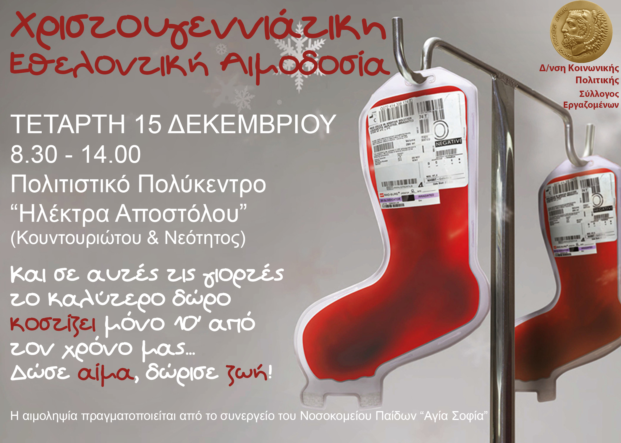 Χριστουγεννιάτικη αιμοδοσία Τετάρτη 15/12 στο Πολιτιστικό Πολύκεντρο