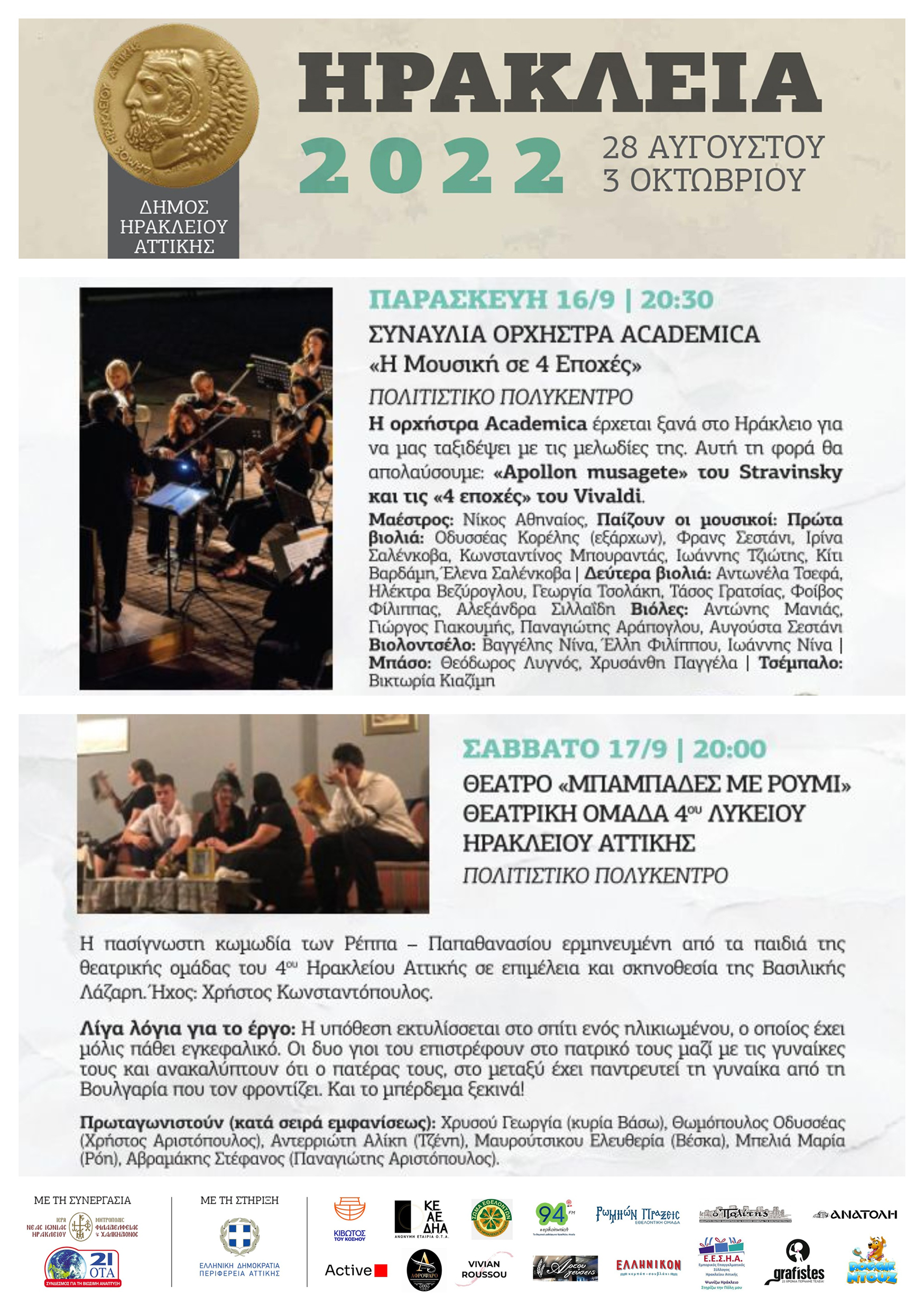 Με μουσική και θέατρο συνεχίζονται τα Ηράκλεια 2022, το ετήσιο, μεγάλο πολιτιστικό Φεστιβάλ του Δήμου Ηρακλείου Αττικής το οποίο έχει ξεκινήσει από τα τέλη Αυγούστου και θα ολοκληρωθεί στις αρχές Οκτωβρίου με εκδηλώσεις στις γειτονιές της πόλης. Από την Παρασκευή 16 έως και την Δευτέρα 19 Σεπτεμβρίου το Τμήμα Πολιτισμού έχει ετοιμάσει κάτι για όλους, μικρούς και μεγάλους. Την Παρασκευή η ορχήστρα Academica ερμηνεύει κλασσικά κομμάτια στο Πολιτιστικό Πολύκεντρο, στην σκηνή του οποίου θα ανέβουν το Σάββατο τα παιδιά του 4ου Λυκείου της πόλης με την παράσταση «Μπαμπάδες με Ρούμι». Την Κυριακή η ημέρα ξεκινάει με το κουκλοθέατρο «Μαθητευόμενος Μάγος», ενώ το απόγευμα η θεατρική ομάδα Ελευθερίας Πράξεις ερμηνεύει τον Κοινό Λόγο. Ακολούθως, οι μαθητές των Εκπαιδευτηρίων Μάνεση ανεβάζουν «Το Μεγάλο μας Τσίρκο». Το τετραήμερο κλείνει τη Δευτέρα με την ομάδα Ρωμηών Πράξεις, η οποία θα παρουσιάσει το βιβλίο της για τα «Σεπτεμβριανά» του 1955. Φυσικά η είσοδος σε όλες τις εκδηλώσεις είναι δωρεάν.