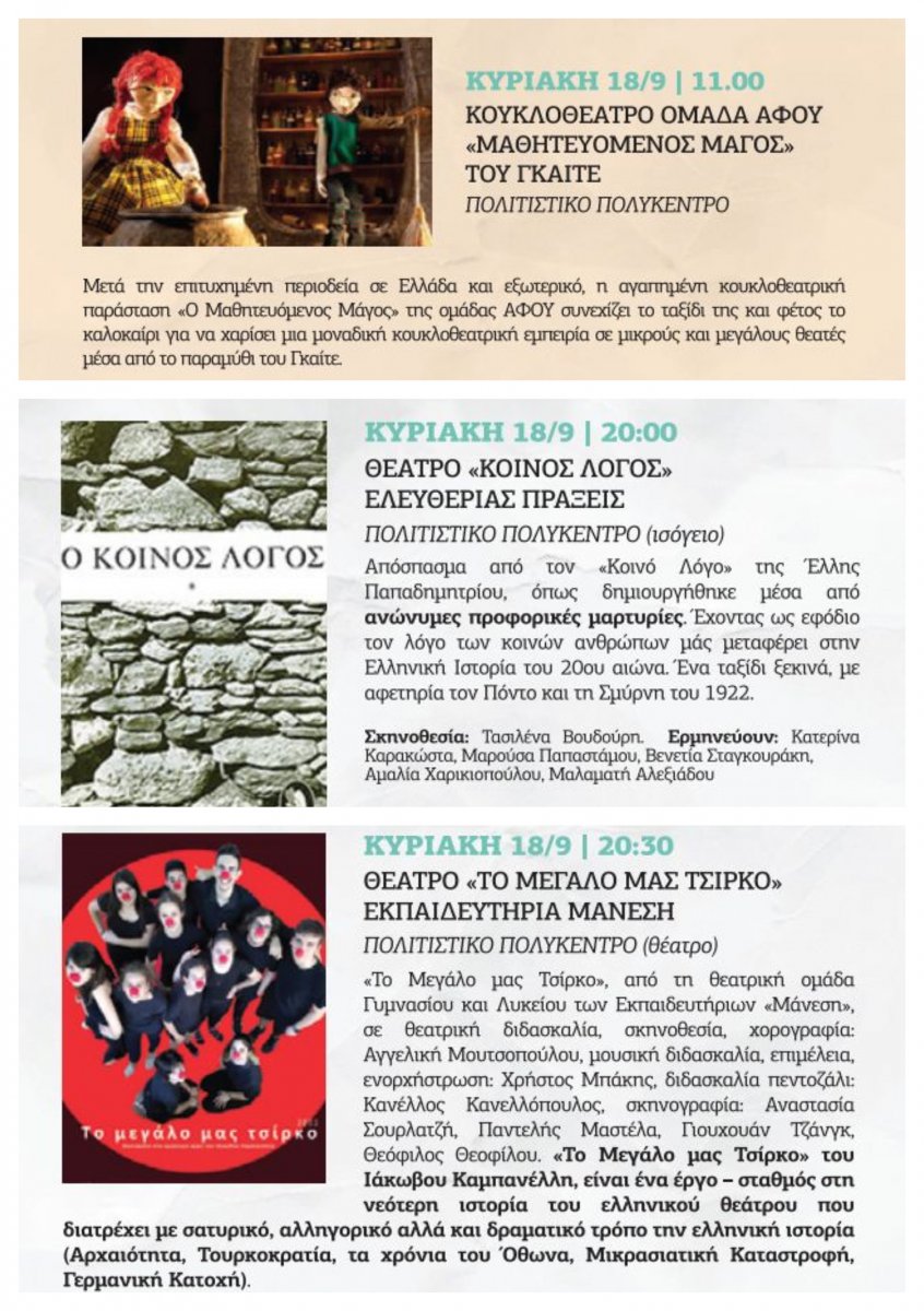 Γεμάτη θέατρο στις σκηνές του Πολιτιστικού Πολύκεντρου είναι η Κυριακή 18 Σεπτεμβρίου. Το πρωί στις 11.00 η ομάδα Αφού παίζει κουκλοθέατρο και ερμηνεύει τον Μαθητευόμενο Μάγο του Γκαίτε.