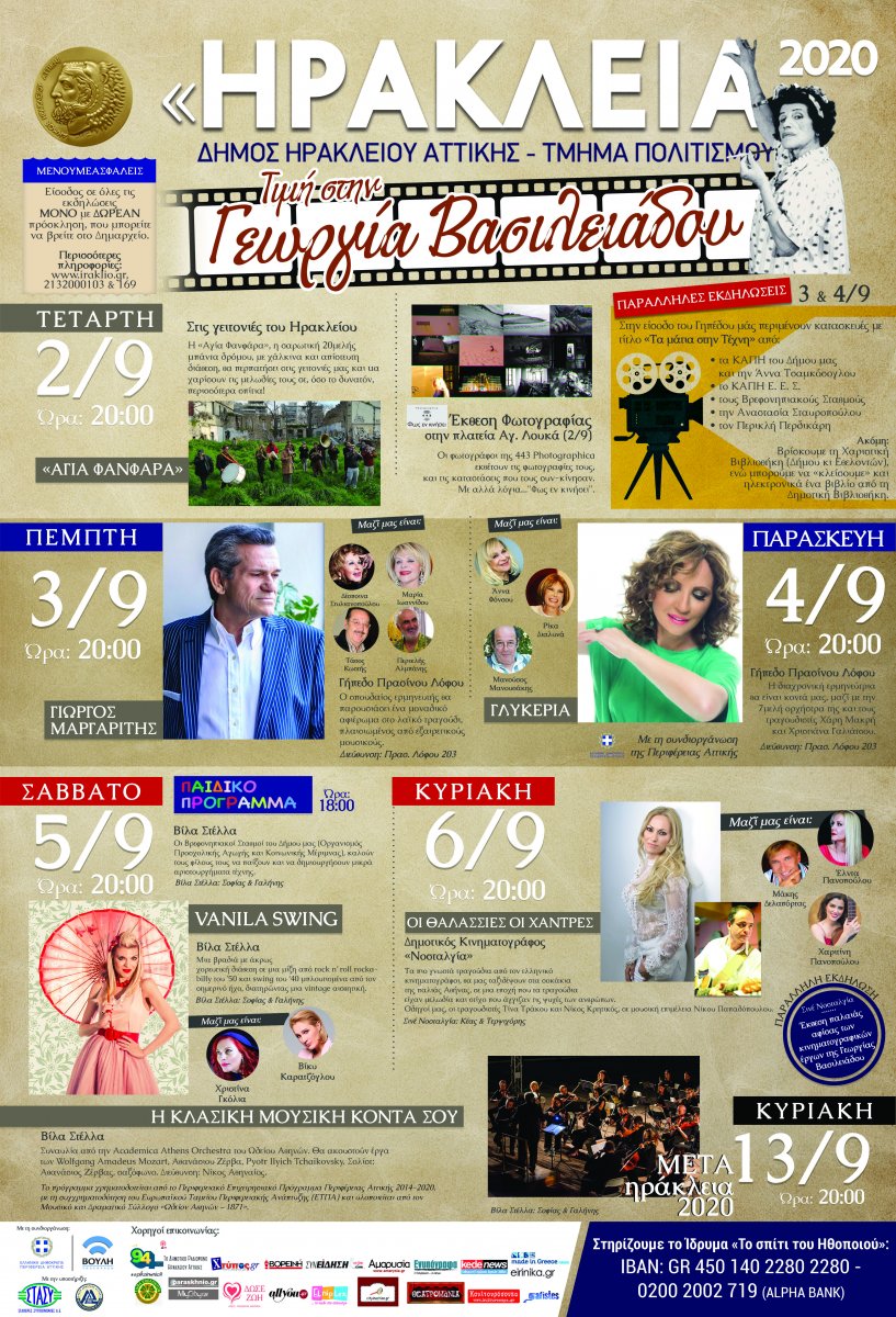 Τη ματαίωση του φετινού κεντρικού πολιτιστικού φεστιβάλ της πόλης, Ηράκλεια 2020, αποφάσισε ο Δήμος Ηρακλείου Αττικής με γνώμονα την προστασία της δημόσιας υγείας, λαμβάνοντας υπόψη τα δεδομένα στο μέτωπο της εξέλιξης της πανδημίας του κορωνοϊού. Το φεστιβάλ είχε προγραμματιστεί για το διάστημα από 2 έως 6 και 13 Σεπτεμβρίου, όπως πάντα με ελεύθερη είσοδο για όλους, με πλούσιο και ενδιαφέρον πρόγραμμα, μουσική και εικόνες, τη συμμετοχή γνωστών καλλιτεχνών και παράλληλες εκδηλώσεις για μικρούς και μεγάλους, για όλες τις προτιμήσεις. Φέτος δε τα Ηράκλεια θα ήταν αφιερωμένα στην Ηρακλειώτισσα, αξέχαστη ηθοποιό, Γεωργία Βασιλειάδου, ενώ μέσα από τις εκδηλώσεις τους θα στήριζαν το «Σπίτι του Ηθοποιού».