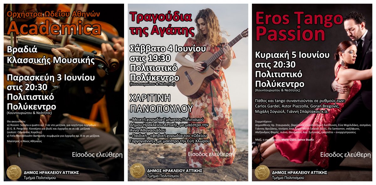 Με ένα τριήμερο γεμάτο μουσική υποδέχεται το καλοκαίρι ο Δήμος Ηρακλείου Αττικής. Το Τμήμα Πολιτισμού ετοίμασε μια σειρά από εκδηλώσεις για Παρασκευή 3, το Σάββατο 4 και την Κυριακή 5 Ιουνίου, όλες στο Πολιτιστικό Κέντρο «Ηλέκτρα Αποστόλου» (Κουντουριώτου & Νεότητος) και, φυσικά, με ελεύθερη είσοδο για όλους.