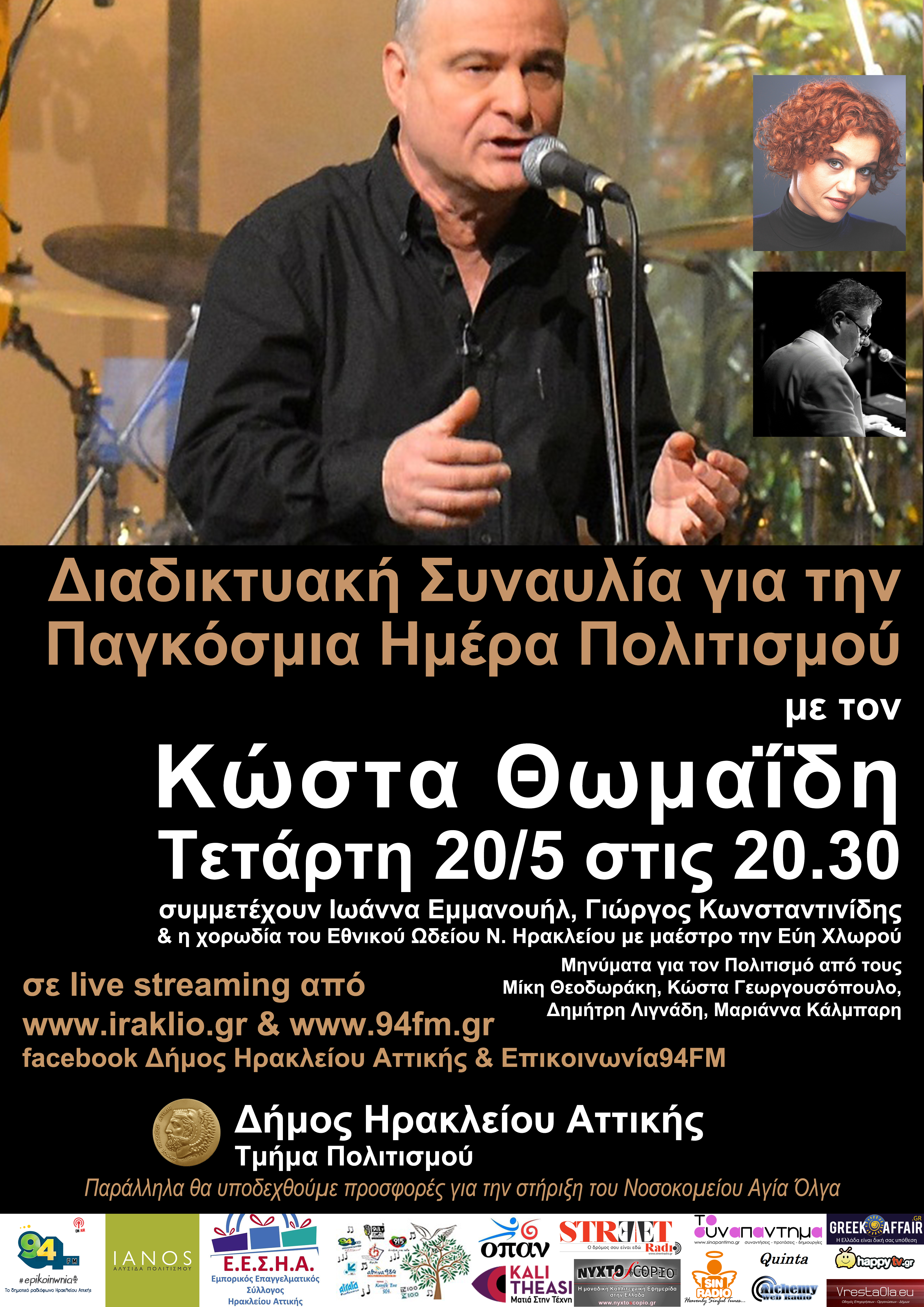 Διαδικτυακή συναυλία με τη μοναδική, μελωδική φωνή του Κώστα Θωμαΐδη διοργανώνει ο Δήμος Ηρακλείου Αττικής την Τετάρτη 20 Μαΐου 20.30 το βράδυ, παραμονή της Παγκόσμιας Ημέρας Πολιτισμού, για να κρατήσει συντροφιά σε όσους επιλέγουν να μείνουν σπίτι, να μείνουν ασφαλείς. Η συναυλία θα μεταδοθεί σε live streaming από τα social media και τις ιστοσελίδες του Δήμου και του Δημοτικού Ραδιοφώνου Επικοινωνία 94FM (facebook Δήμος Ηρακλείου Αττικής, Επικοινωνία 94FM, www.iraklio.gr & www.94fm.gr) με ανοικτή πρόσβαση σε όλους.