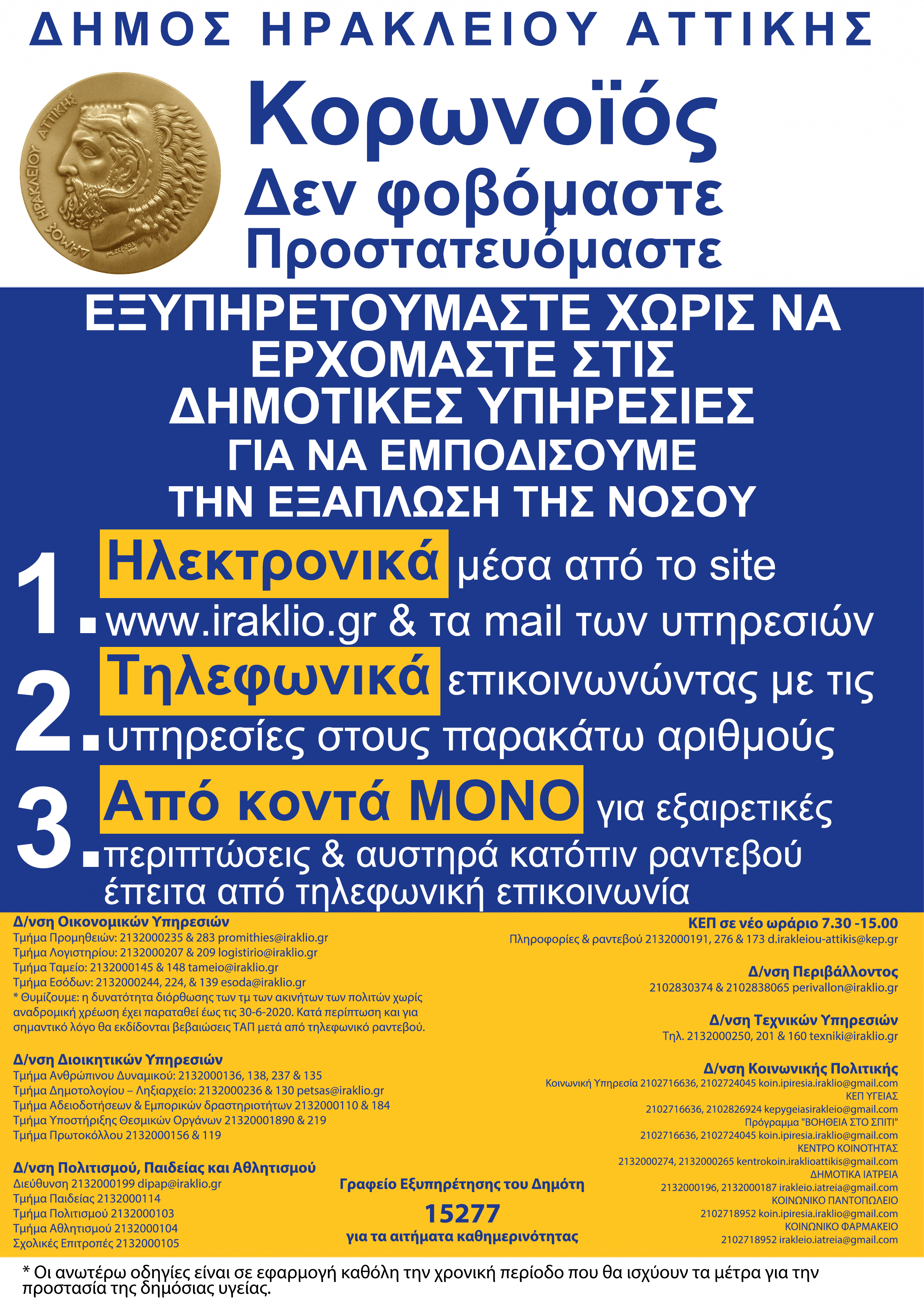 Μόνο κατόπιν ραντεβού θα εξυπηρετούν το κοινό από την Δευτέρα 16-3 οι υπηρεσίες του Δήμου Ηρακλείου Αττικής προκειμένου να περιοριστεί η επαφή του κόσμου τόσο μεταξύ τους, όσο και με τους δημοτικούς υπαλλήλους οι οποίοι, ελέω της φύσης των εργασίας τους, τυχόν να αποτελέσουν κόμβο για την διάδοση του ιού.