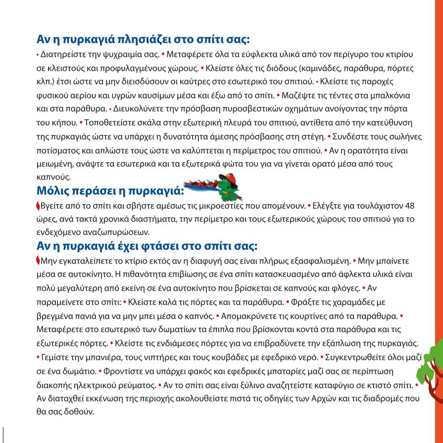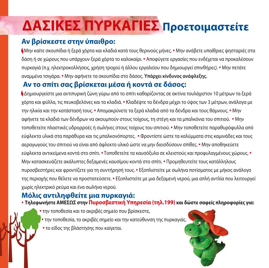 • Τηλεφωνούμε ΑΜΕΣΩΣ στους αριθμούς κλήσης 199 ή 112 και δίνουμε σαφείς πληροφορίες, τόσο για την τοποθεσία και το ακριβές σημείο που βρισκόμαστε, όσο και για τη συγκεκριμένη θέση που βλέπουμε την πυρκαγιά