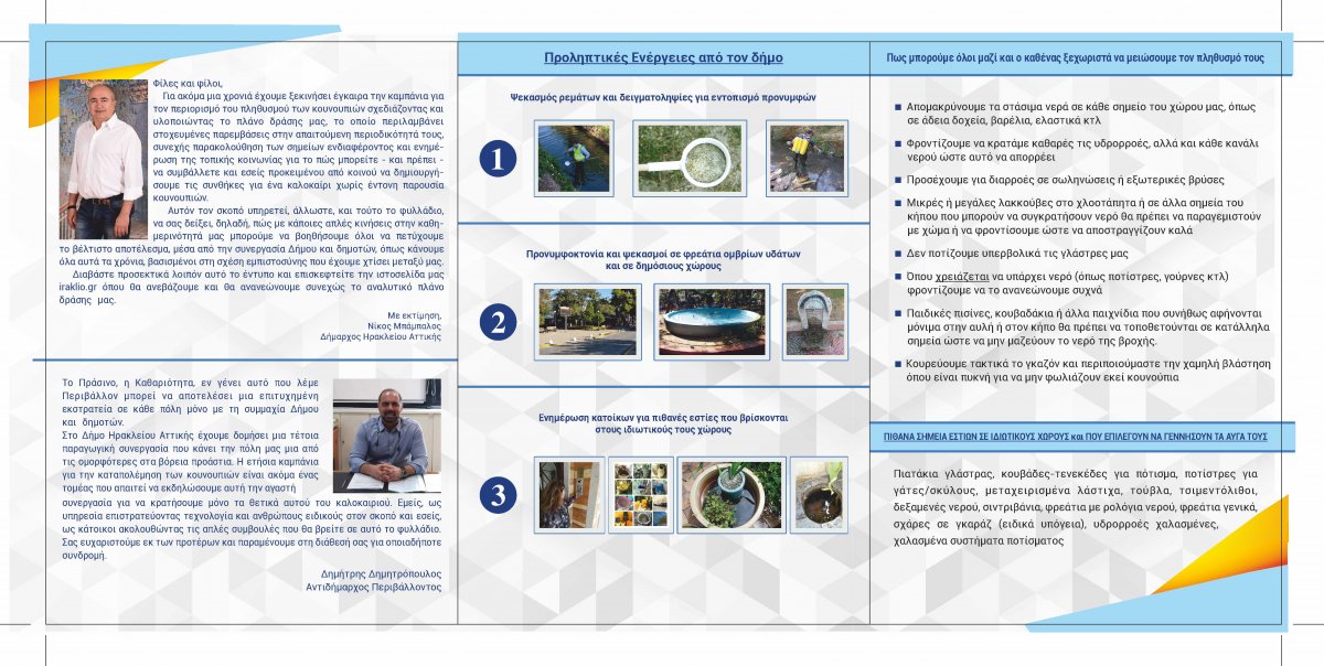 Την ετήσια καμπάνια ενημέρωσης των πολιτών για την καταπολέμηση των κουνουπιών ξεκινά ο Δήμος Ηρακλείου Αττικής. Μετά τις απαραίτητες, προληπτικές παρεμβάσεις που υλοποίησαν, και θα συνεχίσουν να υλοποιούν για όσο χρειάζεται, οι δημοτικές υπηρεσίες, ο Δήμος καλεί τους Ηρακλειώτες να εφαρμόσουν απλές, αλλά καίριες πρακτικές και στον προσωπικό τους χώρο - τις οποίες θα βρουν αναλυτικά στο σχετικό φυλλάδιο που διανέμεται αυτή την περίοδο - ώστε η συμμαχία Δήμου και κατοίκων να εξασφαλίσει ότι δεν θα υπάρξει πρόβλημα από την έντονη παρουσία κουνουπιών.