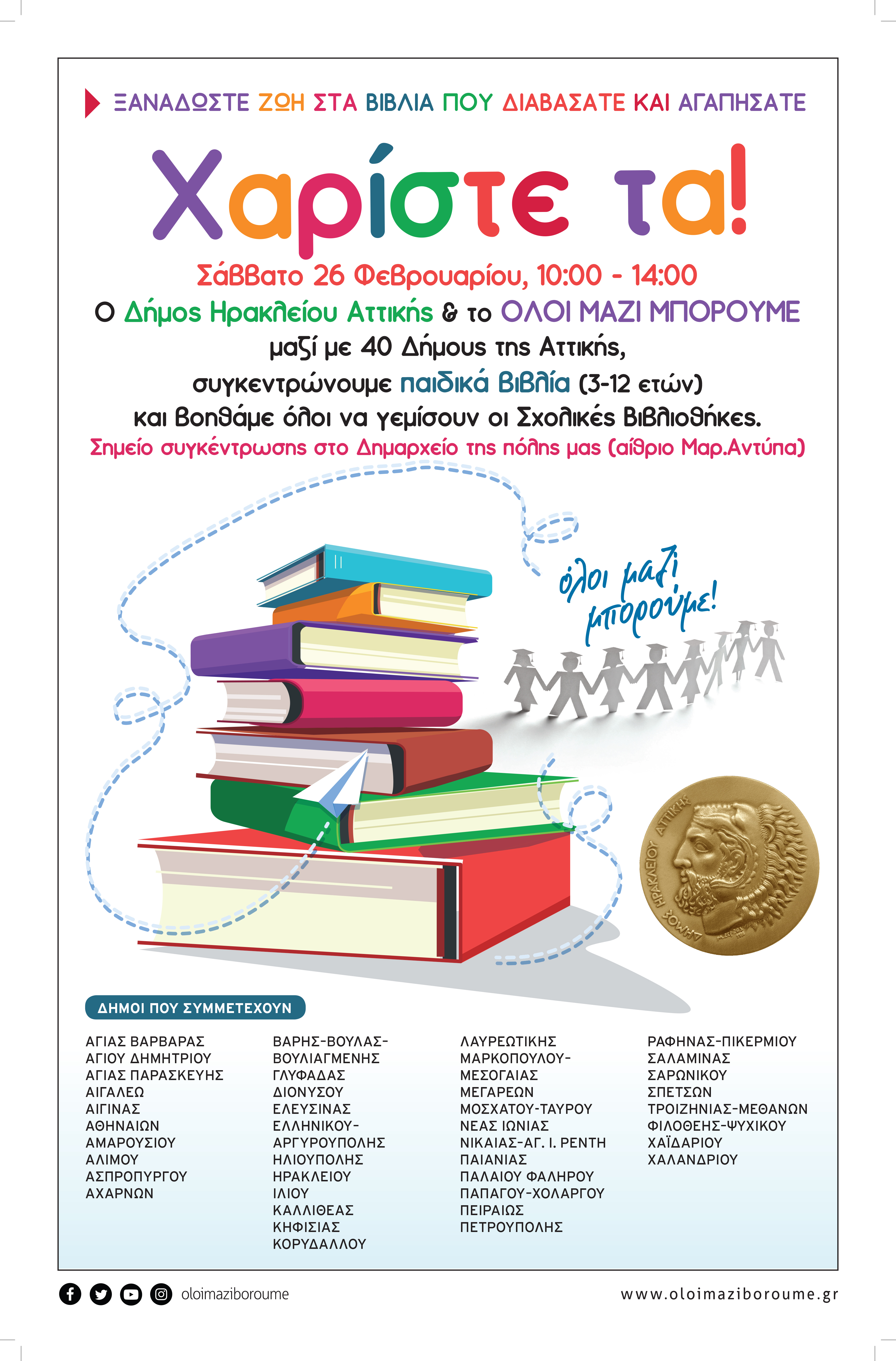 Το Σάββατο 26 Φεβρουαρίου ο Δήμος Ηρακλείου Αττικής συμμετέχει με άλλους 40 δήμους στη δράση του Όλοι Μαζί Μπορούμε και συγκεντρώνει δωρεές βιβλίων τα οποία θα ενισχύσουν τις βιβλιοθήκες των σχολείων της πόλης. Από τις 10.00 το πρωί έως τις 14.00 το μεσημέρι όσοι πολίτες ή φορείς το επιθυμούν μπορούν να φέρουν τις προσφορές τους σε παιδικά ή εφηβικά βιβλία μπροστά από το δημαρχείο (Στ. Καραγιώργη και Μαρίνου Αντύπα).
