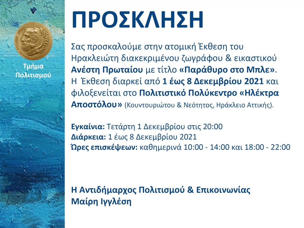 Ο Δήμος Ηρακλείου Αττικής φιλοξενεί την ατομική Έκθεση του διακεκριμένου Ηρακλειώτη ζωγράφου και εικαστικού, Ανέστη Πρωταίου, με τίτλο «Παράθυρο στο Μπλε» στο δημοτικό Πολιτιστικό Πολύκεντρο «Ηλέκτρα Αποστόλου». Η Έκθεση ανοίγει τις πόρτες της την Τετάρτη 1 Δεκεμβρίου και θα διαρκέσει έως τις 8 του ίδιου μήνα με ελεύθερη είσοδο. Τα εγκαίνια θα γίνουν την Τετάρτη 1 Δεκεμβρίου στις 20.00 το βράδυ. Οι ώρες επισκέψεων είναι καθημερινά 10.00 με 14.00 το πρωί και 18.00 με 22.00 το απόγευμα.