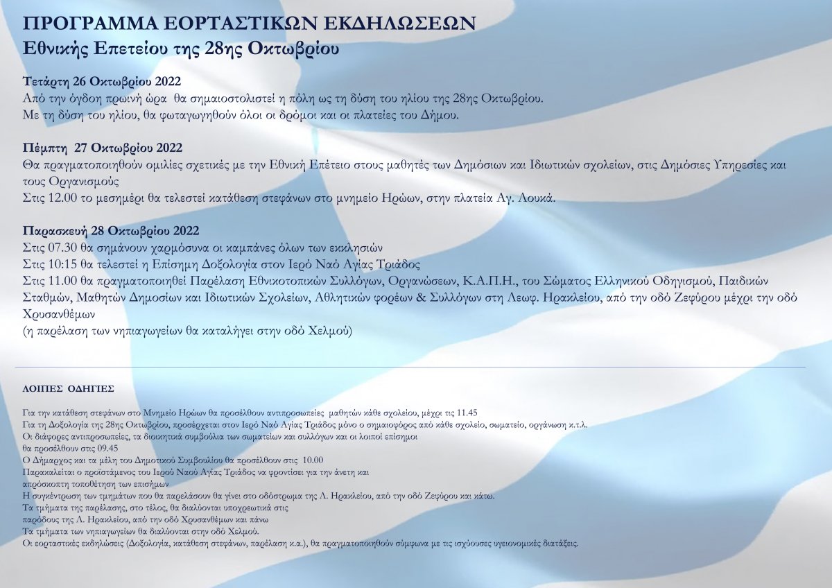 Πρόγραμμα εορτασμού επετείου 28ης Οκτωβρίου στον Δήμο Ηρακλείου Αττικής