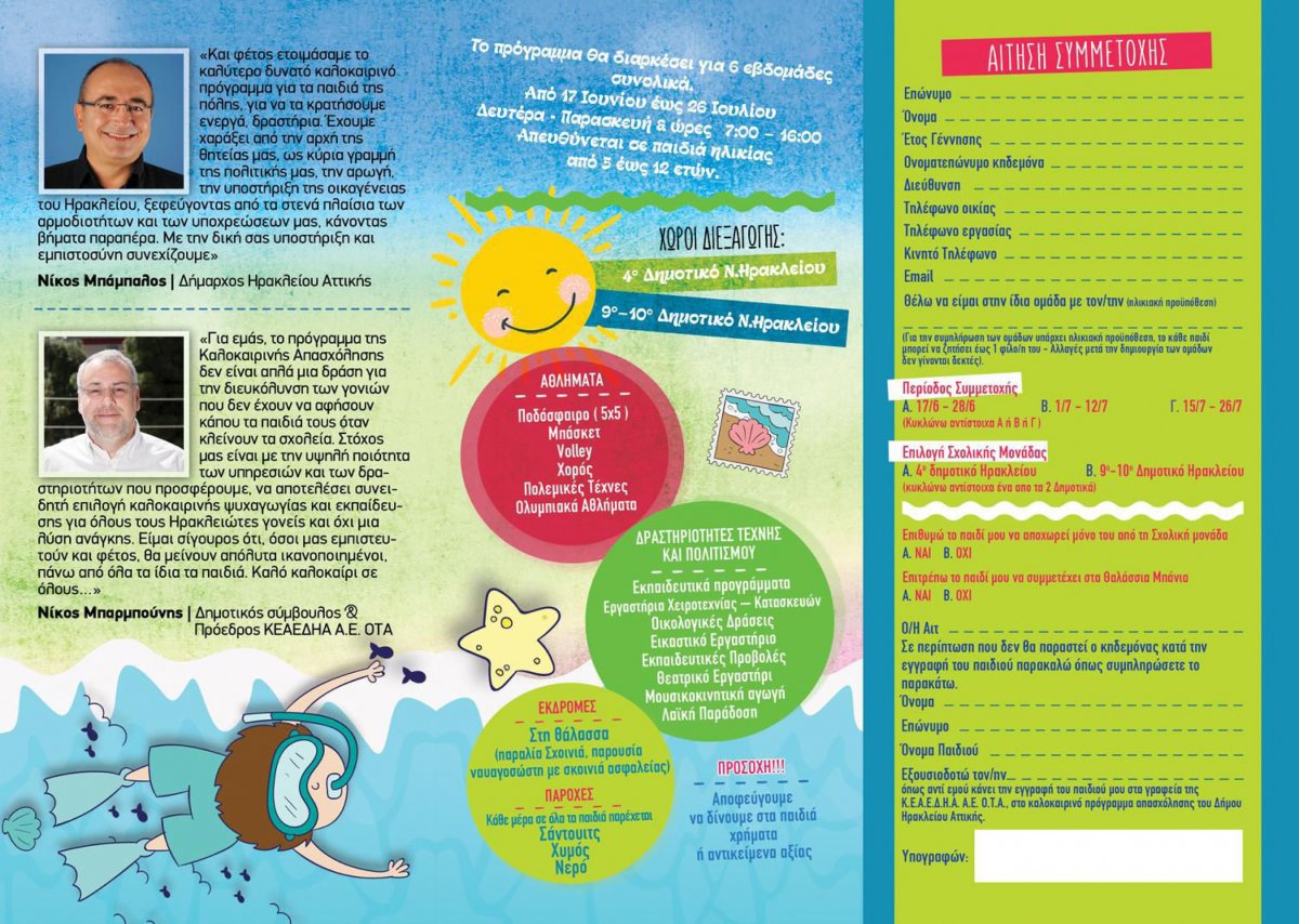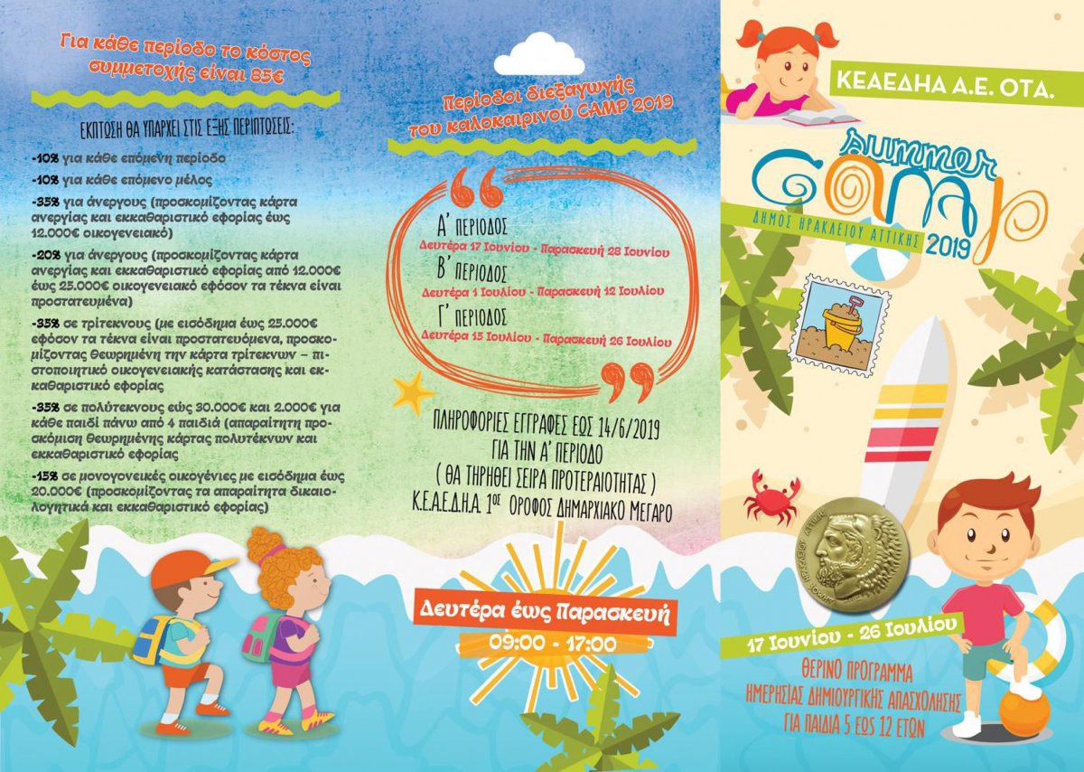 Ένα γεμάτο καλοκαίρι στην πόλη ετοίμασε για τους μικρούς Ηρακλειώτες ο Δήμος Ηρακλείου Αττικής με τα φετινά προγράμματα θερινής απασχόλησης που υλοποιεί, για ακόμα μια χρονιά, η δημοτική επιχείρηση ΚΕΑΕΔΗΑ. Αθλήματα (ποδόσφαιρο, μπάσκετ, βόλεϊ, χορός κ.α.), καλλιτεχνικές και πολιτιστικές δραστηριότητες καθώς και εκδρομές για μπάνιο στην θάλασσα είναι μόνο μέρος από όσα έχουν προγραμματιστεί για τους μικρούς Ηρακλειώτες στις τρεις διαθέσιμες περιόδους των φετινών Camps.