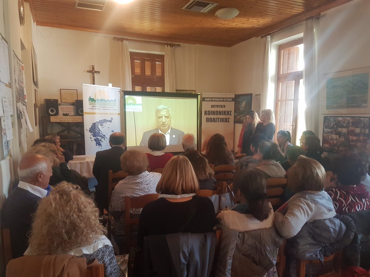 Ο Πρόεδρος του ΕΔΔΥΠΠΥ και της ΚΕΔΕ, κ. Γιώργος Πατούλης, Δήμαρχος Αμαρουσίου απηύθυνε χαιρετισμό μέσω βιντεοσκοπημένου μηνύματος συγχαίροντας το Δήμαρχο κ. Μπάμπαλο και για αυτήν την πρωτοβουλία του που σκοπό έχει την προαγωγή της υγείας των δημοτών μέσα από την πρόληψη. Ο κ. Πατούλης τόνισε: «Η Αυτοδιοίκηση ενωμένη μεριμνά για την καλή υγεία των δημοτών, και στην περίπτωση της νόσου της Άνοιας που απασχολεί ένα πολύ μεγάλο μέρος του πληθυσμού παγκοσμίως. Η δημιουργία φιλικών κοινοτήτων για την άνοια είναι ένα μεγαλόπνοο σχέδιο που θα συμβάλλει ουσιαστικά στην ανακούφιση τόσο των ασθενών όσο και των φροντιστών τους».