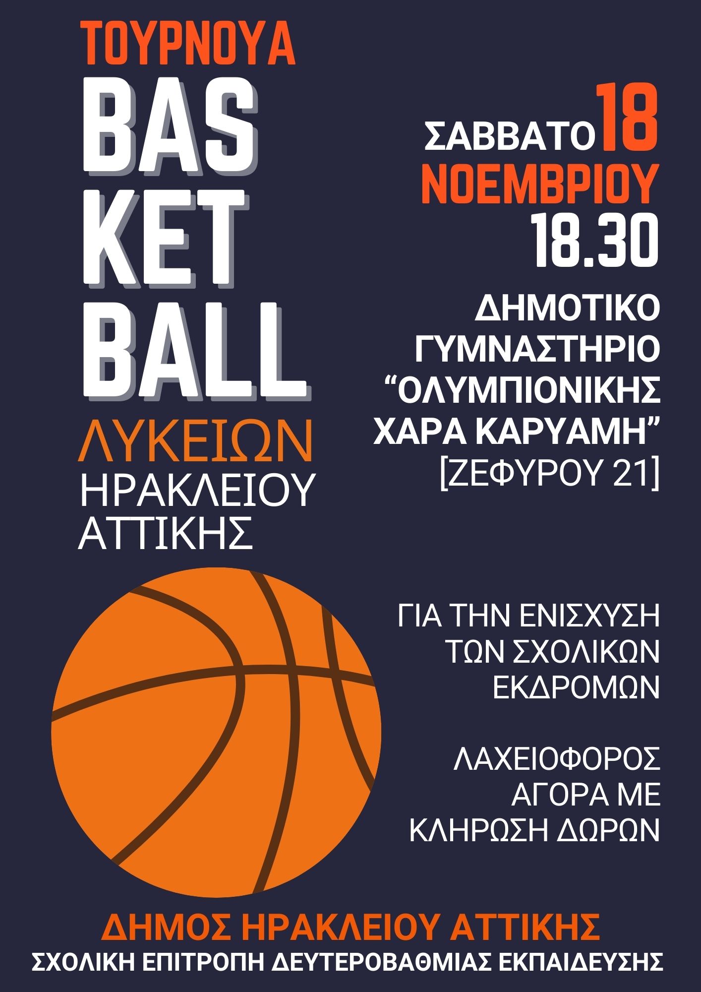 Τουρνουά μπάσκετ ανάμεσα στα τέσσερα λύκεια της πόλης διοργανώνει για ακόμα μια χρονιά ο Δήμος Ηρακλείου Αττικής προκειμένου να συγκεντρωθούν χρήματα τα οποία θα ενισχύσουν τις εκδρομές των παιδιών στην τρέχουσα σχολική χρονιά. Οι ομάδες από κάθε σχολείο θα αναμετρηθούν σε διαδοχικούς αγώνες (ημιτελικούς και τελικό) που θα γίνουν το Σάββατο 18 Νοεμβρίου από τις 18.30 το απόγευμα στο δημοτικό Κλειστό Γυμναστήριο «Ολυμπιονίκης Χαρά Καρυάμη» (Ζεφύρου 21).