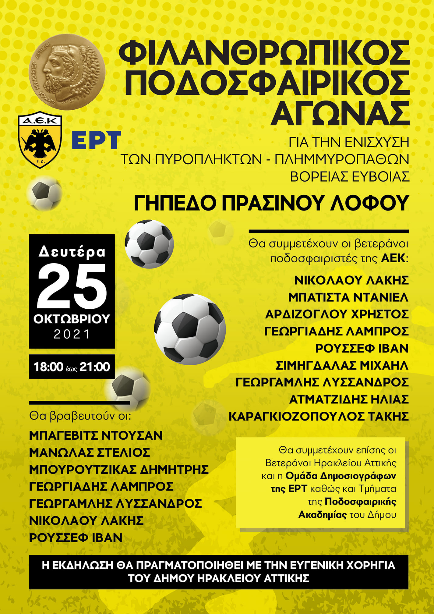Τουρνουά ποδοσφαίρου για την ενίσχυση των κατοίκων της Εύβοιας φιλοξενεί στο δημοτικό γήπεδο της οδού Πρασίνου Λόφου ο Δήμος Ηρακλείου Αττικής τη Δευτέρα 25 Οκτωβρίου με πρώτη σέντρα στις 18.00 το απόγευμα. Οι παλαίμαχοι της ΑΕΚ, οι παλαίμαχοι του Ηρακλείου, η μεικτή ομάδα δημοσιογράφων της ΕΡΤ καθώς και τα παιδιά των Ακαδημιών του Δήμου θα αναμετρηθούν σε μια σειρά από αγώνες, αντίπαλοι στο χορτάρι, ενωμένοι όμως για τον κοινό σκοπό: να υποστηρίξουν τους συνανθρώπους μας στην Εύβοια που επλήγησαν, διαδοχικά, από τις πυρκαγιές και τις κακοκαιρίες.