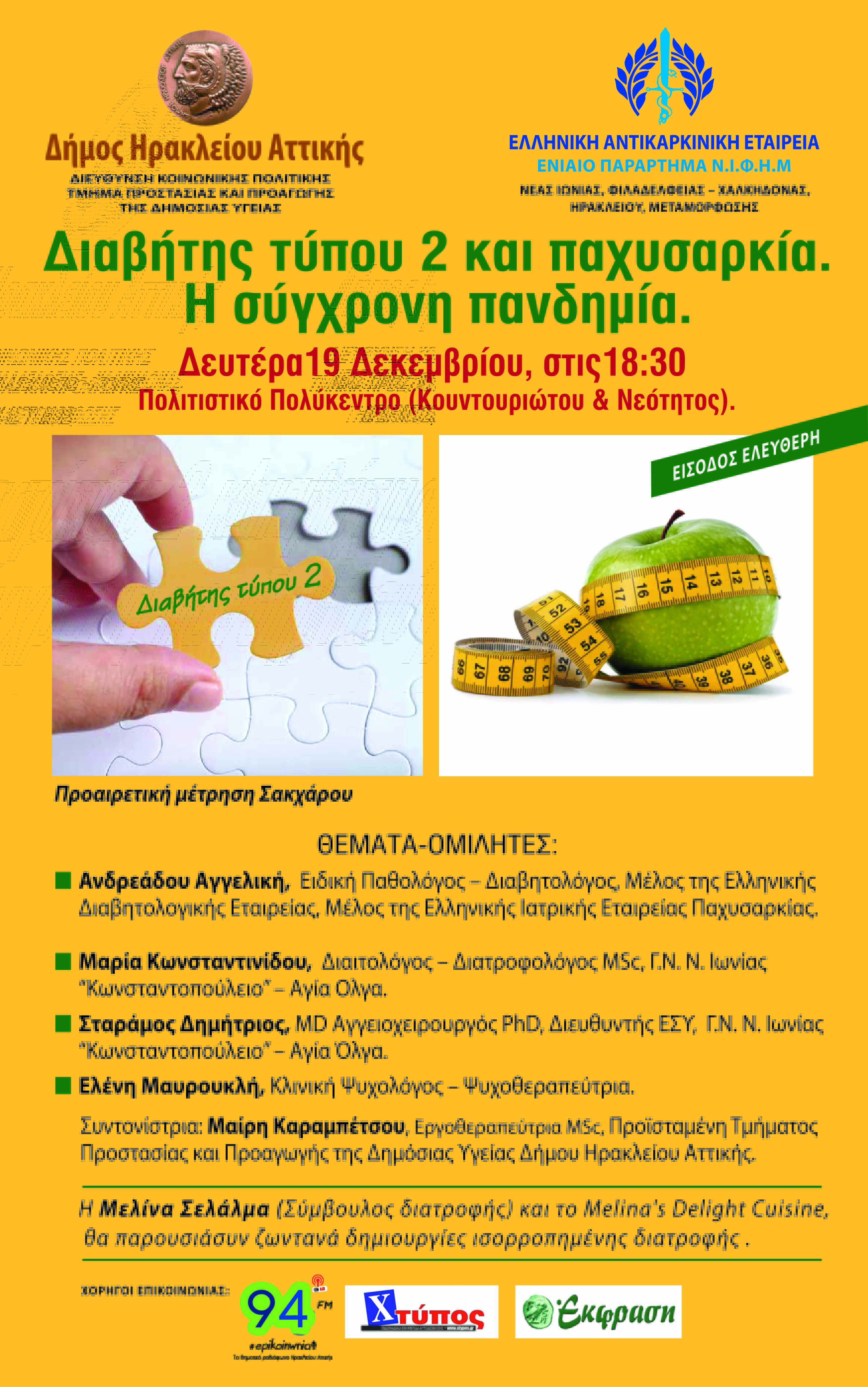 Τρόπους με τους οποίους μπορούμε να υιοθετήσουμε έναν πιο υγιεινό τρόπο ζωής μέσα από τη βελτίωση της διατροφής και έτσι να θωρακίσουμε τον οργανισμό μας απέναντι σε ασθένειες όπως ο διαβήτης, μπαίνουν στο τραπέζι συζήτησης της ανοιχτής ομιλίας που διοργανώνει ο Δήμος Ηρακλείου Αττικής σε συνεργασία με την Ελληνική Αντικαρκινική Εταιρεία (τοπικό παράρτημα ΝΗΦΙΜ) τη Δευτέρα 19 Δεκεμβρίου στις 18.30 στο Πολιτιστικό Πολύκεντρο «Ηλέκτρα Αποστόλου» (Κουντουριώτου & Νεότητος).