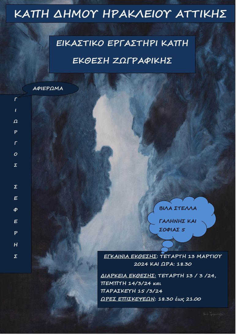 Αφιερωμένη στον μεγάλο Έλληνα ποιητή, Γιώργο Σεφέρη, είναι η νέα έκθεση του Εικαστικού Εργαστηρίου των ΚΑΠΗ του Δήμου Ηρακλείου Αττικής, η οποία ανοίγει τις πόρτες της για το κοινό με εγκαίνια την Τετάρτη 13 Μαρτίου στις 18.30 στον χώρο της Βίλα Στέλλα (Γαλήνης και Σοφίας, Ηράκλειο Αττικής) και διάρκεια δύο ημερών, δηλαδή έως και την Παρασκευή 15 Μαρτίου. Φυσικά η είσοδος είναι ελεύθερη για τους επισκέπτες με ώρες λειτουργίας της Έκθεσης 18.30 με 21.00.