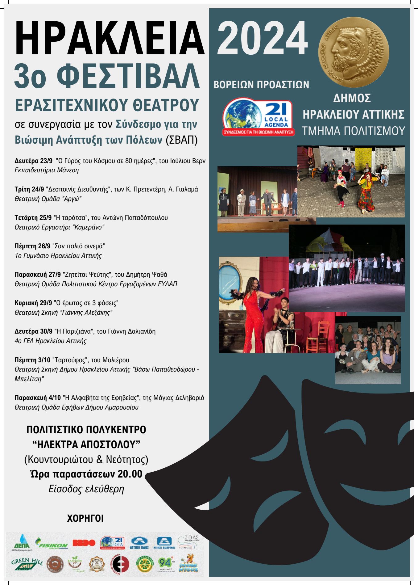 Με το 3ο Φεστιβάλ Ερασιτεχνικού Θεάτρου Βορείων Προαστίων συνεχίζονται τα Ηράκλεια 2024, το ετήσιο, πολιτιστικό φεστιβάλ του Δήμου Ηρακλείου Αττικής, που ξεκίνησε φιλοξενώντας στο Κτήμα Φιξ τα προηγούμενα δύο τριήμερα Παρασκευής – Κυριακής εκδηλώσεις γεμάτες μουσική, δρώμενα και παιδικό παιχνίδι.