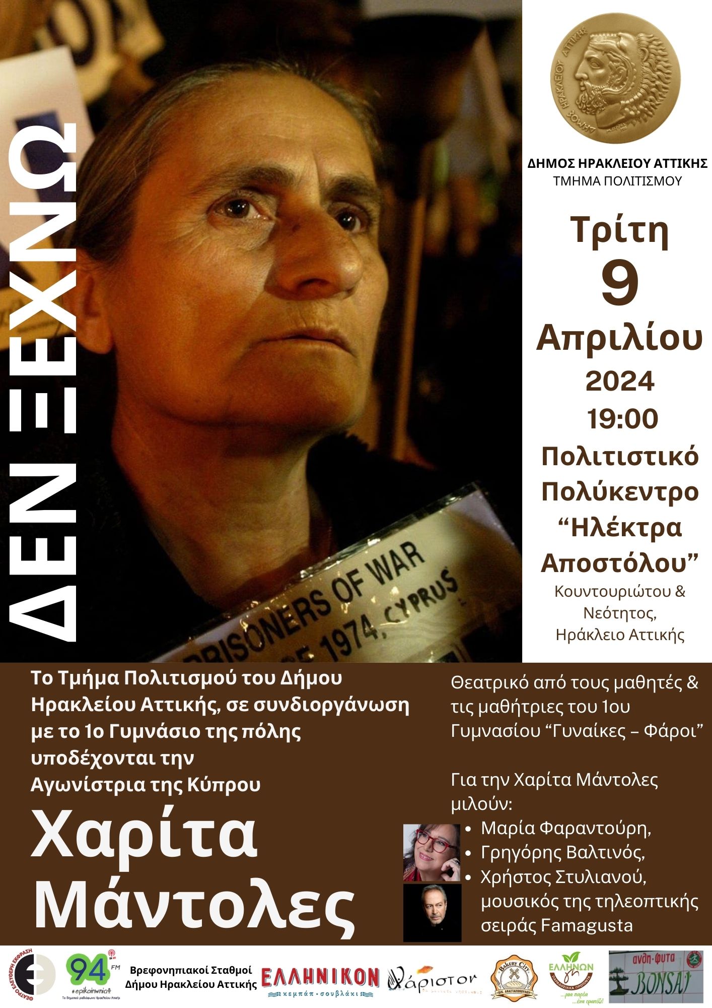 Η γυναίκα που αποτελεί το πρόσωπο του αγώνα των συγγενών των αγνοούμενων από την εισβολή στην Κύπρο έρχεται στον Δήμο Ηρακλείου Αττικής. Το Τμήμα Πολιτισμού του Δήμου και το 1ο Γυμνάσιο Ηρακλείου Αττικής υποδέχονται την Χαρίτα Μάντολες και διοργανώνουν προς τιμήν της εκδήλωσης μνήμης και ιστορίας την Τρίτη 9 Απριλίου στις 19.00 στην κεντρική αίθουσα του Πολιτιστικού Πολύκεντρου «Ηλέκτρα Αποστόλου».