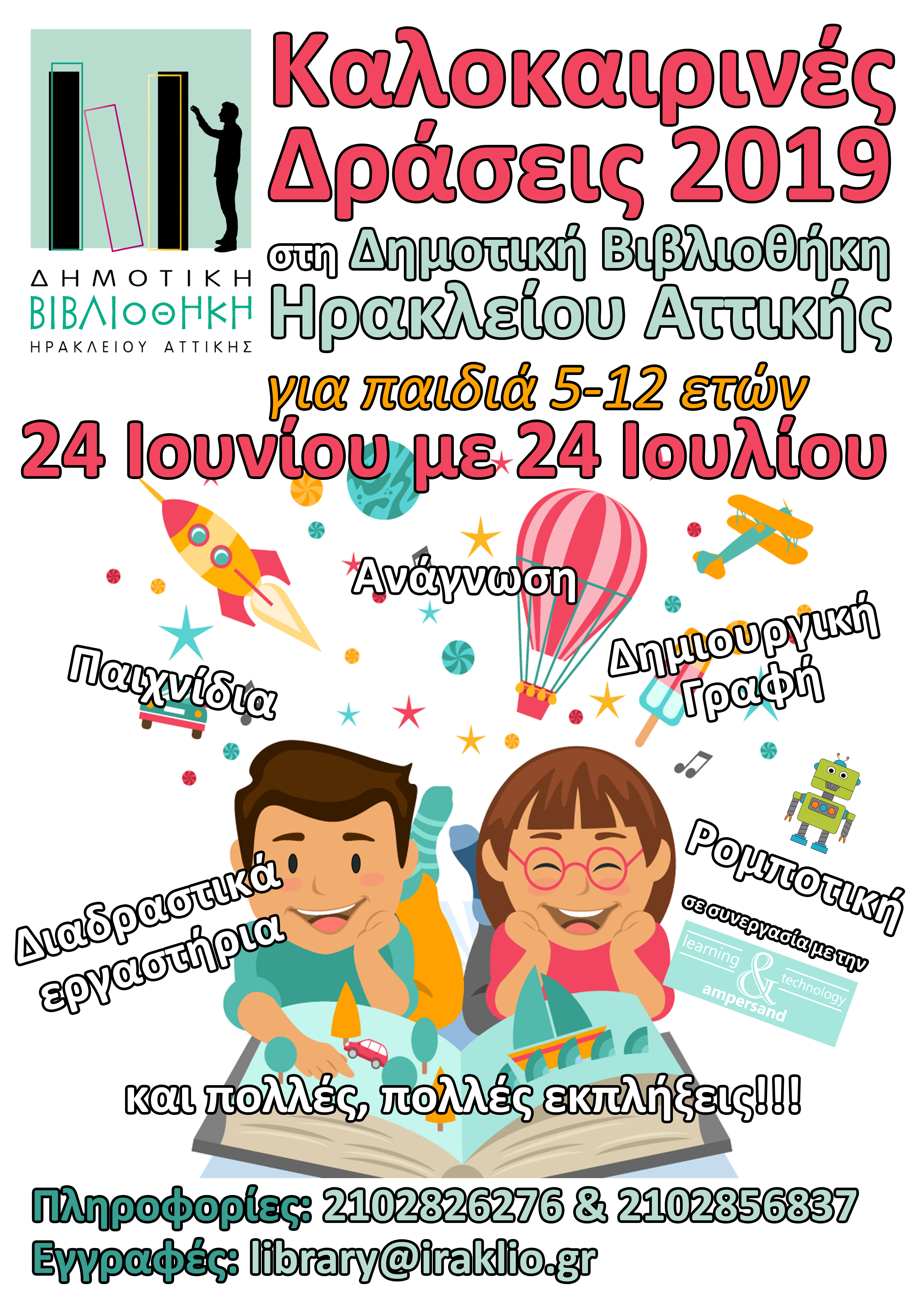 Καλοκαιρινά ταξίδια στο μαγικό κόσμο των βιβλίων προσφέρει και φέτος στους μικρούς αναγνώστες της πόλης η Δημοτική Βιβλιοθήκη του Δήμου Ηρακλείου Αττικής. Διαμορφωμένο για παιδιά από 5 έως 12 ετών, το πρόγραμμα για αυτό το καλοκαίρι αρχίζει στις 24 Ιουνίου και ολοκληρώνεται στις 24 Ιουλίου. Περιλαμβάνει δράσεις σχεδιασμένες και επιμελημένες με μεράκι που πραγματοποιούνται με τη βοήθεια εξαιρετικών εθελοντών τα πρωινά του καλοκαιριού.