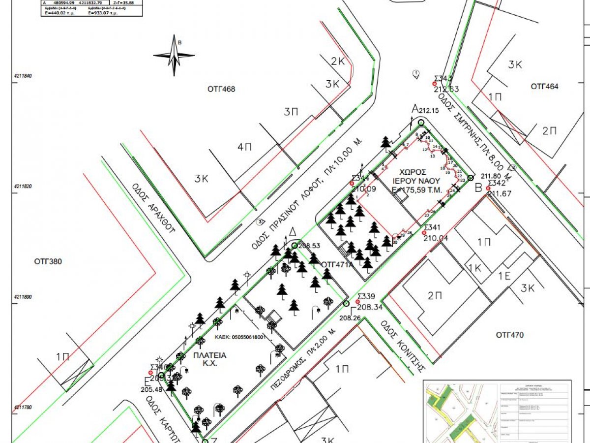 1. Ο καθορισμός της θέσης και της διάταξης του του κτιρίου του ναού από τα όρια (ρυμοτομικές γραμμές) του τετραγώνου – καθορισμός κόκκινου περιγράμματος – ως ακολούθως: Αποστάσεις Κτιρίου από τα όρια του οικοπέδου: 0,96 μ για την οδό Αγίας Σοφίας, 0,59 μ για την οδό Σμύρνης και 1,22 μ για την οδό Πρασίνου Λόφου.