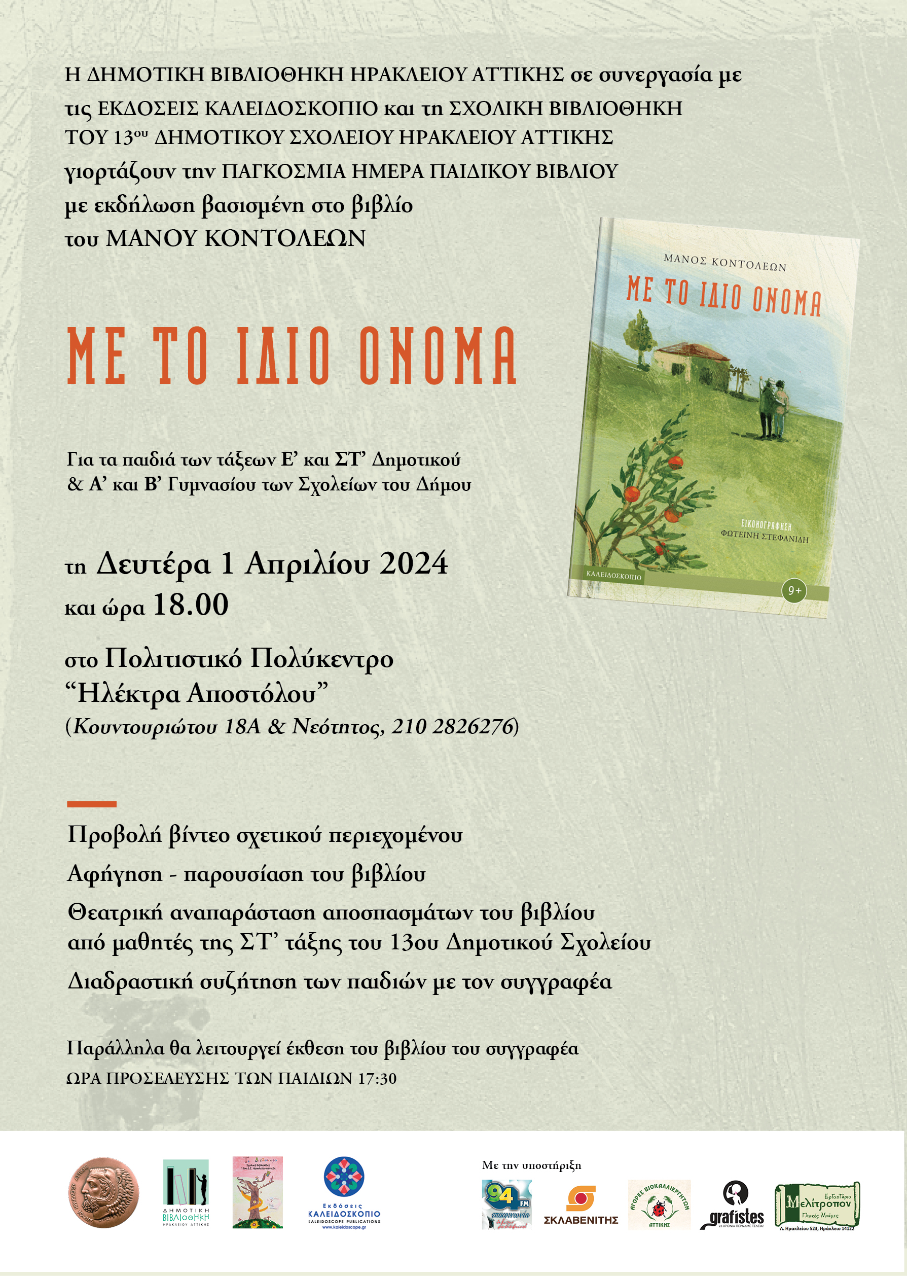 Σε συνεργασία με τις εκδόσεις Καλειδοσκόπιο, στο επίκεντρο της εκδήλωσης θα είναι το βιβλίο του Μάνου Κοντολέων, «Με το ίδιο όνομα». Μια ιστορία με αφορμή τις μεγάλες πυρκαγιές στην χώρα μας, το βιβλίο στέλνει μηνύματα για τη σχέση ανθρώπου και φύσης, πώς αυτή πρέπει να διέπεται από σεβασμό σε αντίθεση με τις καταστροφικές τάσεις της σύγχρονης εποχής. Η εικονογράφηση του βιβλίου έχει γίνει από την βραβευμένη Ηρακλειώτισσα ζωγράφο Φωτεινής Στεφανίδη.