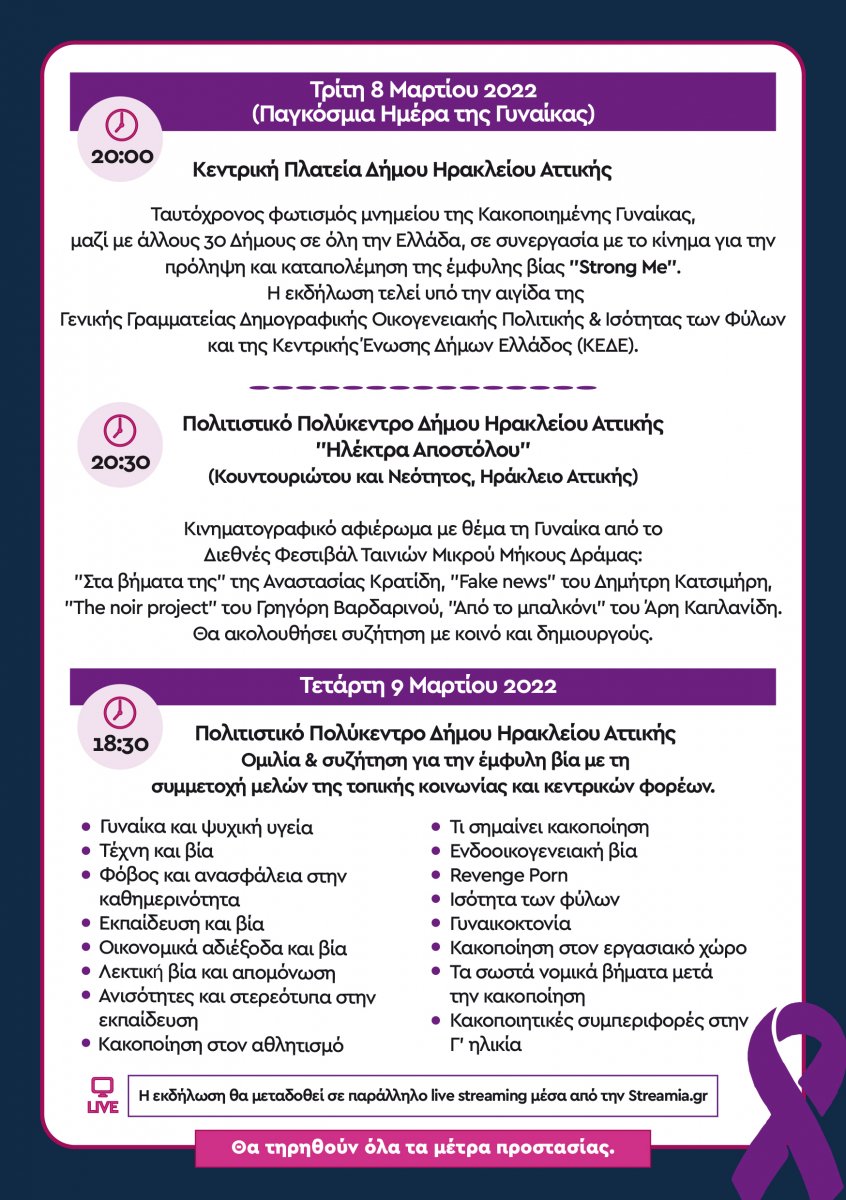 Την επομένη της Παγκόσμιας Ημέρας, Τετάρτη 9 Μαρτίου, και πάλι στο Πολιτιστικό Πολύκεντρο στις 18.30 το απόγευμα ο Δήμος διοργανώνει ανοικτή συζήτηση με θέμα την έμφυλη βία στην οποία θα μιλήσουν γυναίκες από την πολιτική, την Τέχνη, την αστυνομία, την δικαιοσύνη κα. Συγκεκριμένα παρούσες θα είναι γυναίκες δημοτικοί σύμβουλοι του Δήμου Ηρακλείου Αττικής ενώ έχουν προσκληθεί για να παραστούν και να μιλήσουν οι: Ζωή Ράπτη, υφυπουργός Υγείας, Λουκία Κεφαλογιάννη, αντιπεριφερειάρχης Βόρειου Τομέα Αθήνων, Μαίρη Βιδάλη, περιφερειακή σύμβουλος εντεταλμένη για θέματα Πολιτισμού, Άννα Βερούλη, πρωταθλήτρια στίβου, πρώην δημοτική και νομαρχιακή σύμβουλος, Έρη Ρίτσου, συγγραφέας και κόρη του Γιάννη Ρίτσου, Σοφία Βαγενά, αξιωματικός της ΕΛ.ΑΣ. εκπρόσωπος Αλληλεγγύης Γυναικών, Ασπασία Θεοφίλου, καλλιτέχνης και επικεφαλής του κινήματος Strong Me, Μαίρη Πίνη, πρόεδρος ΚΕΣΟ, Κορίνα Κουρκουτά, Δημοτικό Ραδιόφωνο Επικοινωνία 94FM, Στέλλα Αθανασίου, κοινωνική λειτουργός υπεύθυνη ΚΑΠΗ Δήμου Ηρακλείου Αττικής, Νίκη Λαλαούνη, δικηγόρος. Η εκδήλωση θα μεταδοθεί σε live streaming από το Streamia.gr.