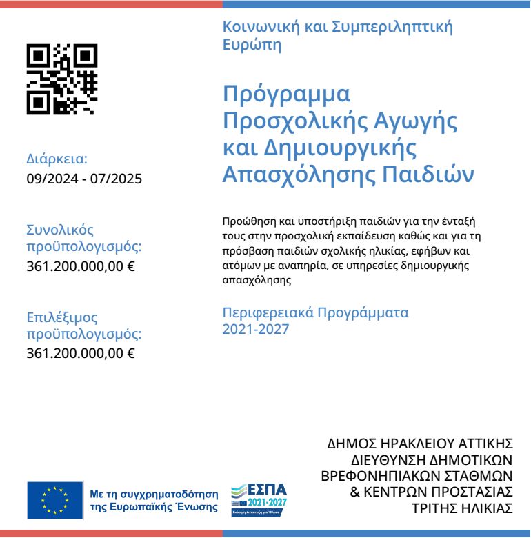 * Ο Δήμος Ηρακλείου Αττικής εφαρμόζει ειδικές απαλλαγές – εκπτώσεις στα δίδακτρα, οι οποίες όμως, σύμφωνα με την υπ' αρ. 155/24-07-2024 Απόφαση του Δημοτικού Συμβουλίου Ηρακλείου Αττικής, εξυπηρετούν κατά προτεραιότητα τις οικογένειες που δεν έχουν την δυνατότητα συμμετοχής στο πρόγραμμα παροχής voucher φιλοξενίας από το αντίστοιχο ετήσιο πρόγραμμα της ΕΕΤΑΑ, έναντι όσων είχαν την δυνατότητα να λάβουν voucher και αμέλησαν να το κάνουν. Συνεπώς προτρέπουμε οι οικογένειες που πληρούν τα κριτήρια συμμετοχής στο εν λόγω ετήσιο πρόγραμμα να φροντίζουν να υποβάλλουν αίτηση.