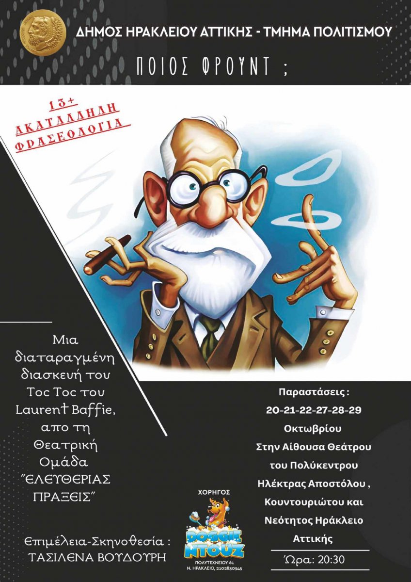 Την παράσταση "Ποιος Φρόυντ" παρουσιάζει για δύο τριήμερα στο θέατρο του Πολιτιστικού Πολύκεντρου "Ηλέκτρα Αποστόλου" η ομάδα Ελευθερίας Πράξεις. Σε σκηνοθεσία της Τασιλένας Βουδούρη, το έργο είναι μια διασκευή του διάσημου "Τοκ Τοκ" με χιλιάδες παραστάσεις ανά την υφήλιο.