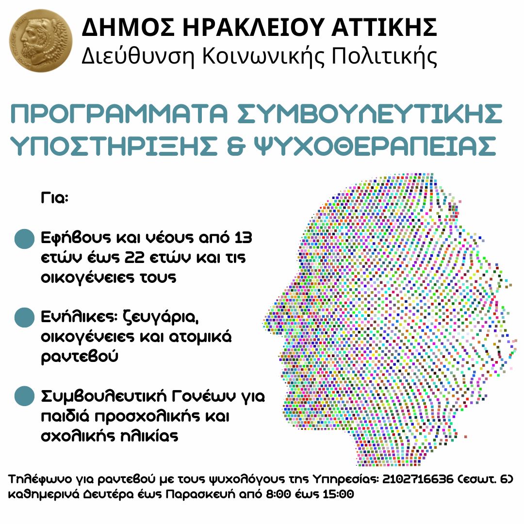 Ψυχολογική και συμβουλευτική υποστήριξη σε εφήβους και ενήλικες που νιώθουν ότι το έχουν ανάγκη συνεχίζει να προσφέρει ο Δήμος Ηρακλείου Αττικής. Οι ψυχολόγοι της Διεύθυνσης Κοινωνικής Πολιτικής είναι πάντα πρόθυμοι να προγραμματίσουν δωρεάν συνεδρίες με κατοίκους – δημότες που θα απευθυνθούν στην υπηρεσία.
