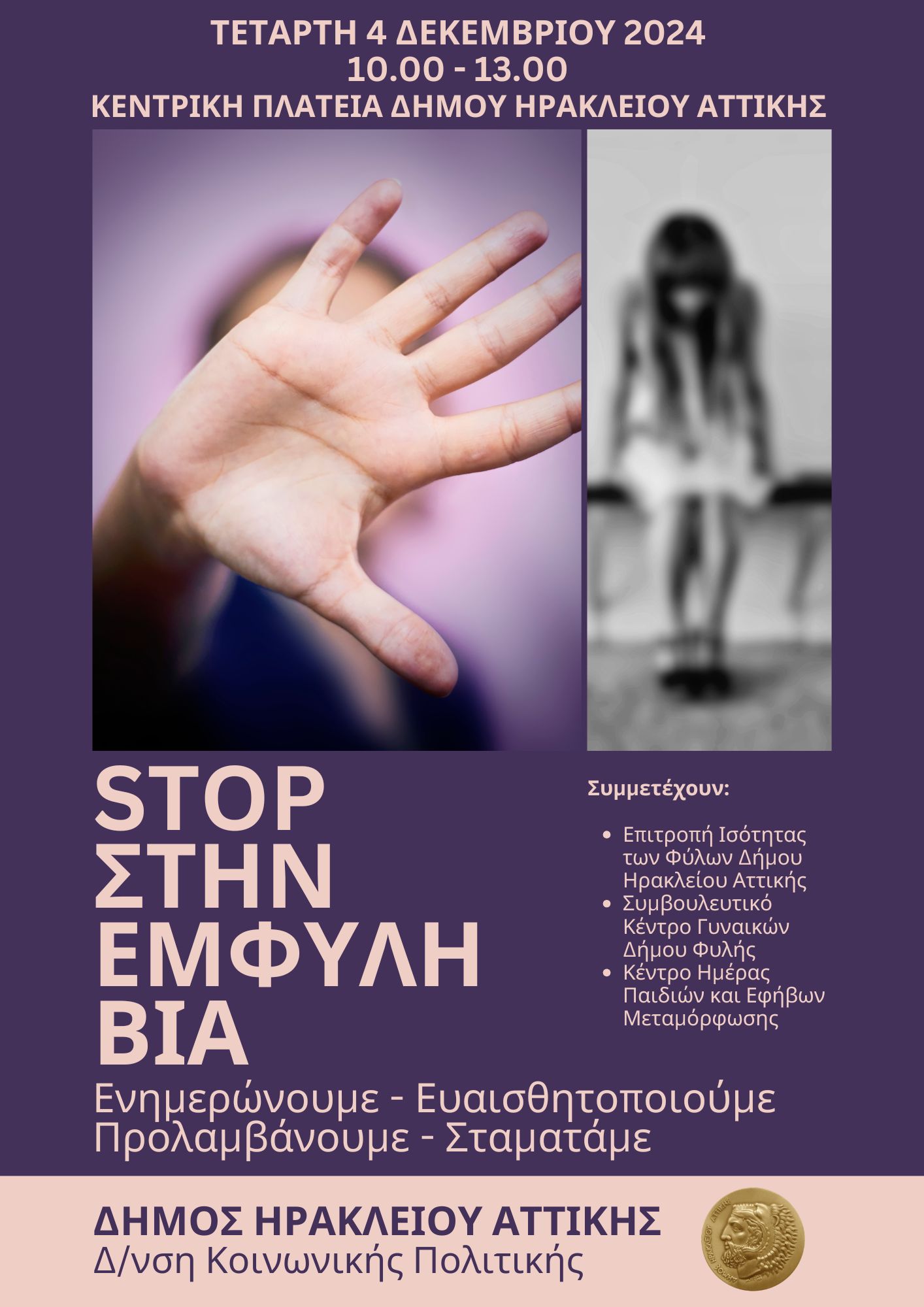 Με σύνθημα το τετράπτυχο «ενημερώνουμε – ευαισθητοποιούμε – προλαμβάνουμε – σταματάμε» ο Δήμος Ηρακλείου Αττικής οργανώνει δράση κατά της έμφυλης βίας το πρωί της Τετάρτης 4 Δεκεμβρίου στην κεντρική πλατεία της πόλης. Από τις 10.00 το πρωί έως τις 13.00 το μεσημέρι οι άνθρωποι της Διεύθυνσης Κοινωνικής Πολιτικής του Δήμου θα βρίσκονται στην πλατεία, έξω από τον σταθμό ΗΣΑΠ του Ηρακλείου, για να μοιράζουν ενημερωτικό υλικό αλλά και να απαντάνε στις ερωτήσεις που τυχόν να έχουν οι πολίτες.
